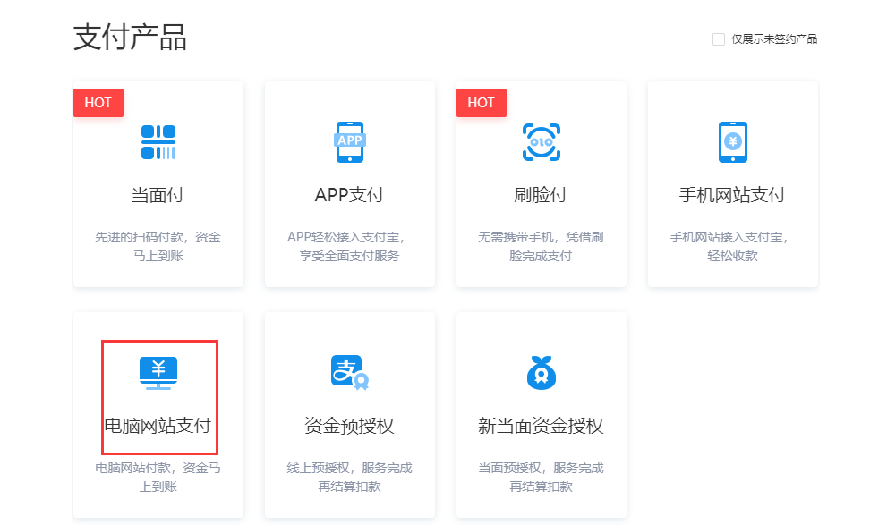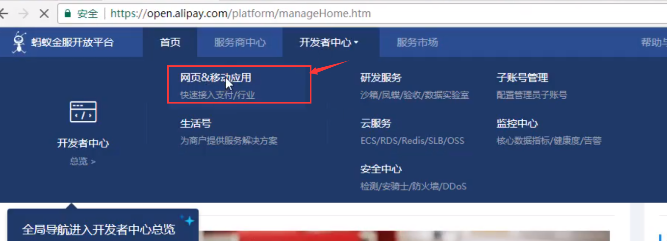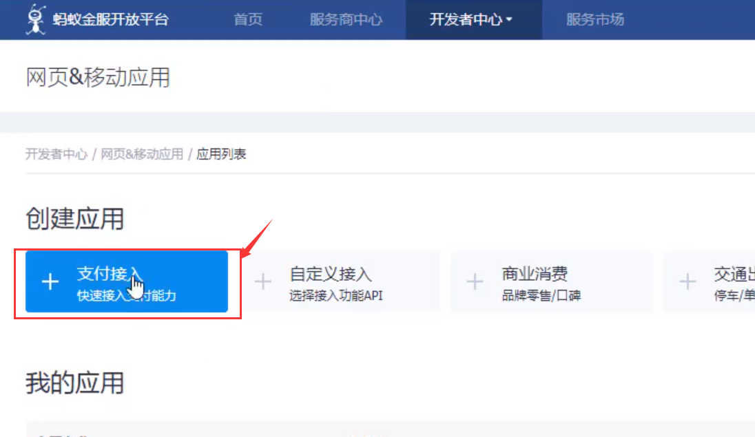 打开并登陆支付宝,点击我是支付宝商家->点击产品中心->点击电脑网站支付->点击立即接入->然后点击顶部的开放平台等这些操作和旧版的操作一样